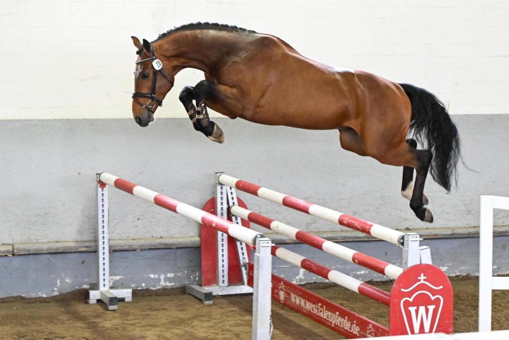 The four-year-old Holsteiner stallion Magnus von der Söhr made a lasting impression during the Holsteiner stallion licensing and scored an 8.8 for jumping ability during his performance test in Münster-Handorf in April 2024. With an average score of 8.12, he was the best three-year-old showjumping stallion in this mini-test.
